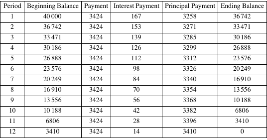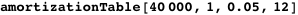 Using this function, we compute an amortization table for a loan of $40,000 with 1-year loan term, 5% APR paid monthly.
