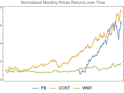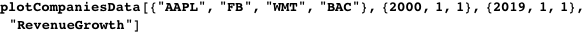 We plot the revenue growth of Apple, Facebook, Walmart and Bank of America over the period January 1, 2000, to January 1, 2019.
