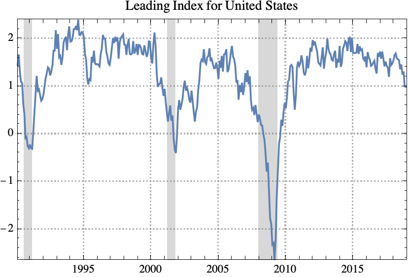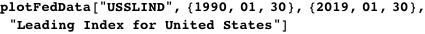 Now we can download any series and plot it. For example, we download and plot the Leading Index for the United States (USSLIND) over the period January 30, 1990, to January 30, 2019. Please use the API key 207071a5f2e90e7816259d3c32c1ab81 if needed. The shaded regions indicate recession periods.