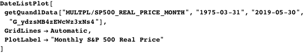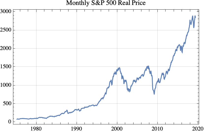 We download and plot the historical real S&P 500 prices by month (MULTPL/SP500_REAL_PRICE _MONTH) over the period March 31, 1975, to May 30, 2019.