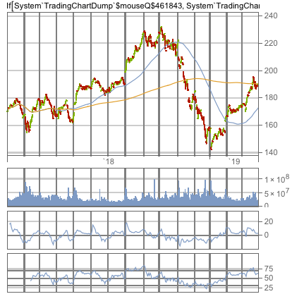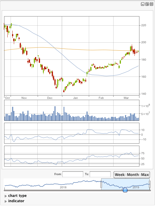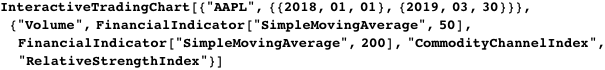 For example, we make a chart showing prices, volume and indicators for historical data of Apple’s stock over the period January 1, 2018, to March 30, 2019. The