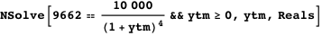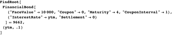 For example, we compute the yield to maturity of a zero-coupon bond with a $10,000 face value, time to maturity 4 years and current price $9,662 using