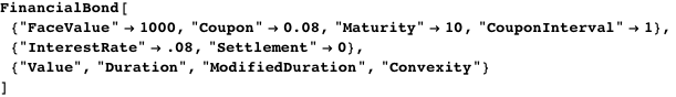 can also be used to compute the price, duration, modified duration and convexity of a bond. For example, we compute those values for a bond with 8% yield, 8% annual coupons, 10-year maturity and $1,000 face value.