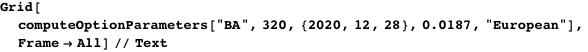 We compute the European-style option parameters for Boeing (BA), assuming that the option expires on December 28, 2020, with exercise price $145 and risk-free rate 0.0187. Make sure that the expiration date is later than the current date, since
