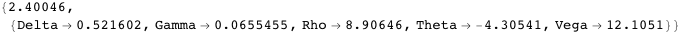 computes the values and other price sensitivity measures for common types of derivative contracts. The function can compute the value of an option, any of delta, gamma, theta and vega, as well as the implied volatility of the contract. The Mathematica documentation provides many examples of how to use