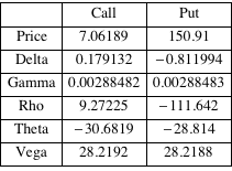 For example, we compute the price and Greeks of the European-style put option with strike price $50, expiration date 0.3846 years, interest rate 5%, annual volatility 20%, no annual dividend and current price $49.