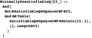 ; then it tests if all the formulas with one clause deleted are indeed satisfiable.