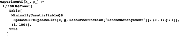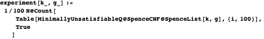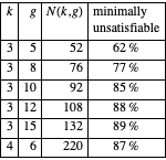 ”, stands for the number of clauses in the CNF defined by SpenceCNF@SpenceList[k,g]. The fourth column gives the percentage of these clauses that were minimally unsatisfiable.