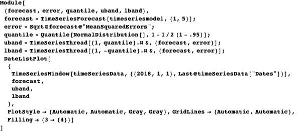 Data collected over time is common in finance. Mathematica has many built-in functions to model the stochastic nature of financial time series and to forecast the future value of a series. This section gives examples of functions that are useful for model specification, estimation, diagnostics and forecasting of univariate time-series data.