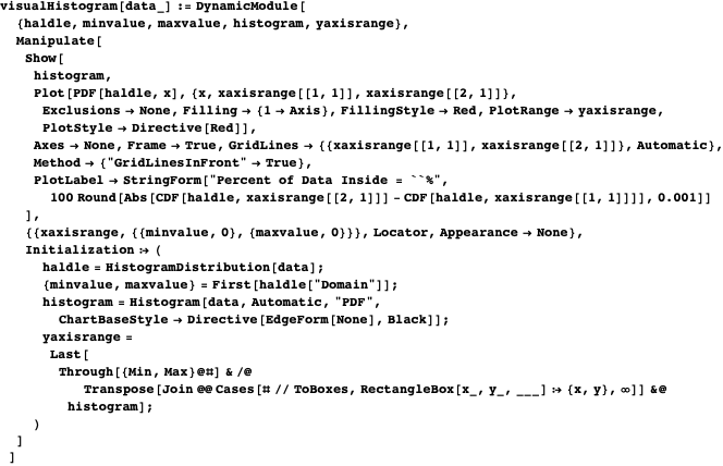 function was taken from Stack Exchange Network (https://mathematica.stackexchange.com/questions/194234/plot-of-histogram-similar-to-output-from-risk) and modified. The function takes a vector of numerical data and returns a histogram with a handle on each side. You can drag these two thin vertical gray lines to vary the percentage of data within two values.