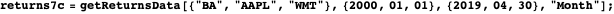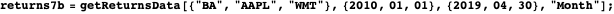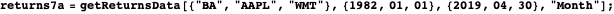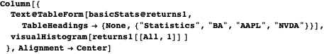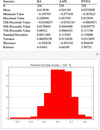 For example, this downloads monthly historical stock returns for Boeing Company (BA), Apple Inc. (AAPL) and NVIDIA Corporation (NVDA) for the period May 1, 2000, to May 30, 2019, and computes descriptive statistics. We chose returns of the Boeing Company for the histogram. Drag the handles at the far ends of the histogram (the thin vertical lines) to see the percentage of values that lie within two values.