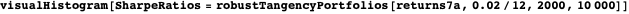 We download historical monthly returns as before, compute the distribution of maximum Sharpe ratios and draw a histogram.