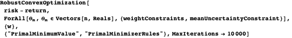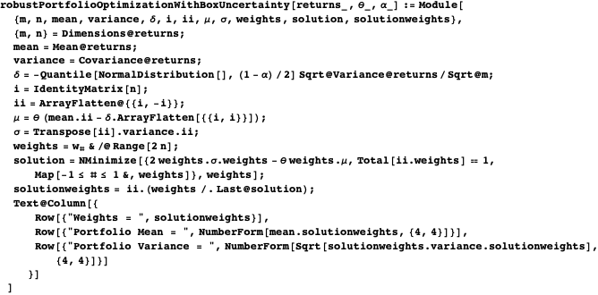 to find the solution to the mean variance optimization problem with box uncertainty. This function takes three arguments: