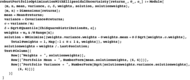 to compute an optimal portfolio with an ellipsoidal uncertainty. It takes three arguments:
