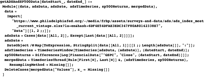 . It downloads the ADS index from the Federal Reserve Bank of Philadelphia and the S&P 500 index returns and then merges them for use in the