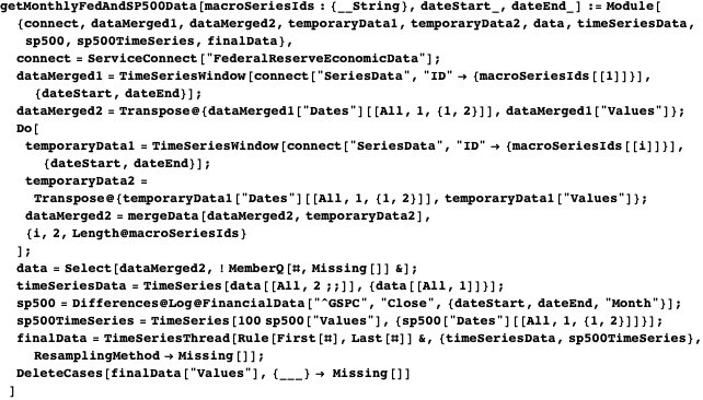 ), start date and end date as input arguments. It returns values for specified macroeconomic variables and S&P 500 index returns in the format suitable for the