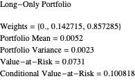 This downloads monthly returns of three stocks over the period May 1, 2000, to May 30, 2019, and computes the CVaR-based optimal weights and associated values given the target portfolio return and confidence level.