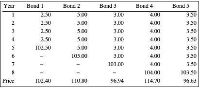 Also assume that we have five government bonds available to invest with the cash flows from the obligations and current prices given as follows.